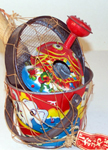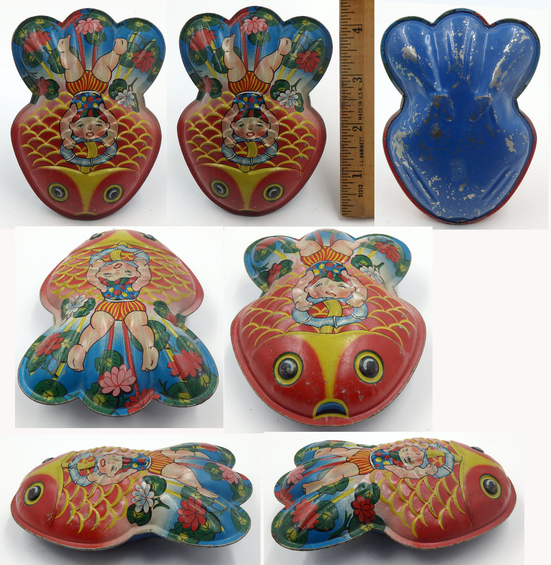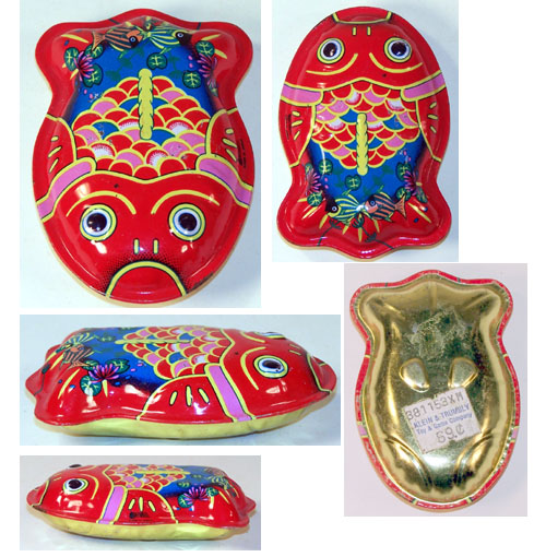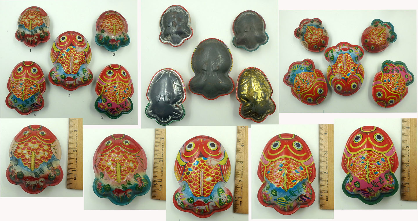 Japanese Tin Fish Rattle-Colored Ovals on Tail 4.25 inches (10.8 cm) long VG-EX Again we see the alternate fish rattle shape with the
