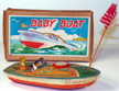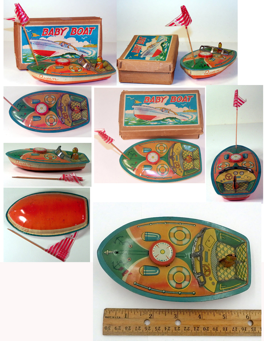 some of the wear occured. $265. One Only 6.25 inches (15.5 cm) long Good Plus in Box This non-mechanical tin 1950's Japanese speedboat with