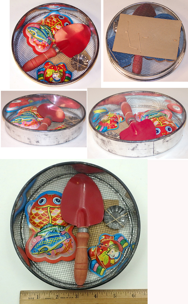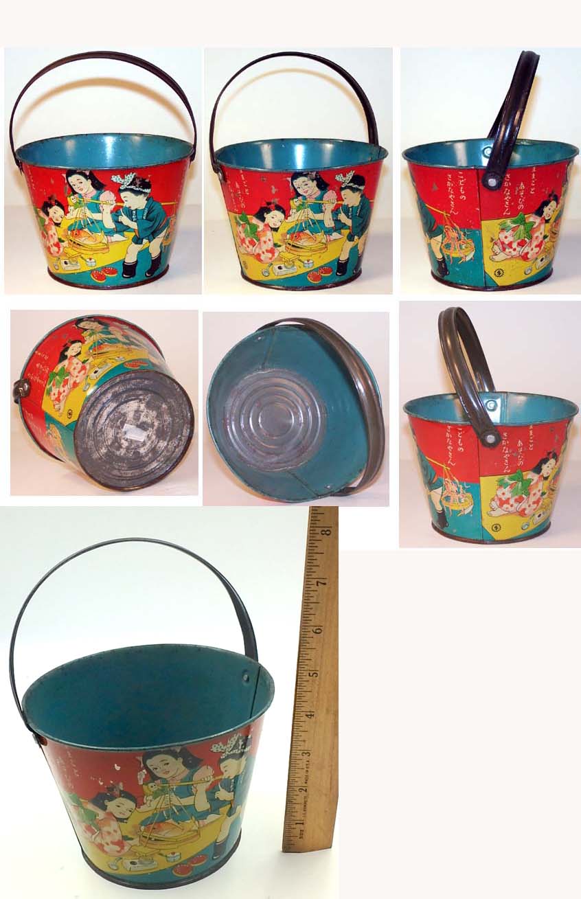 condition. $155. One Only Pail 2.5 inches (6.3 cm) tall without handle EX in original Net Bag This 1950's Japanese tin sand toy set is still in the