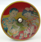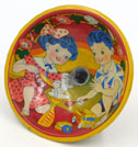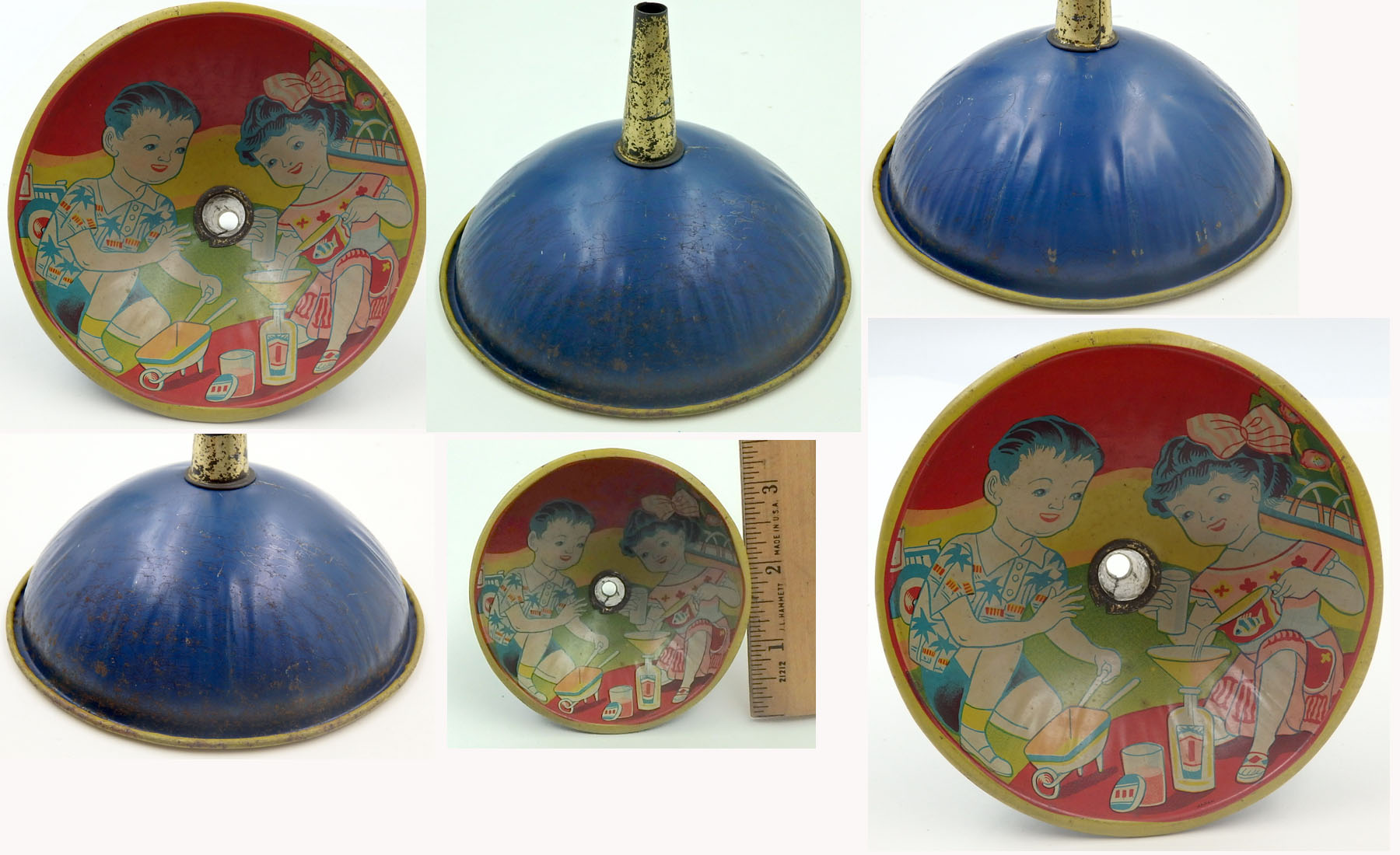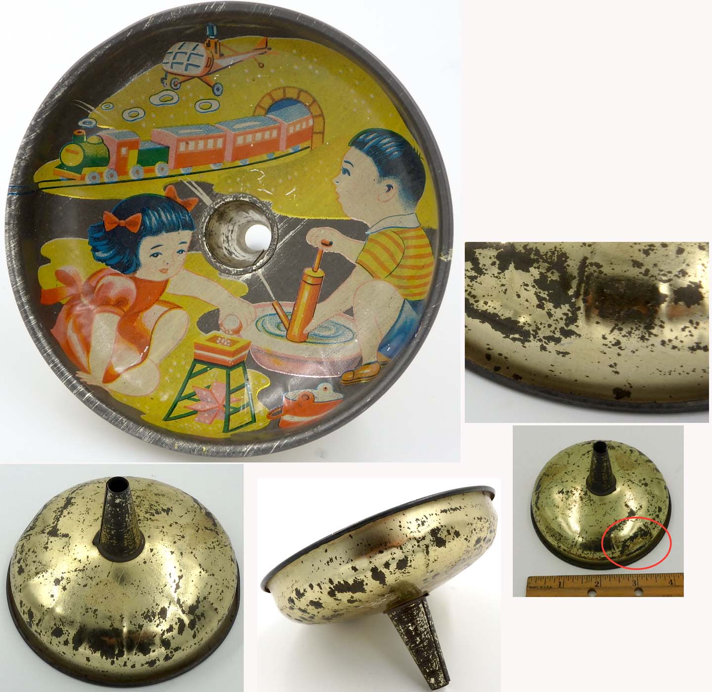 along one side just below the edge. $40 One Only. 3.75 inches (9.5 cm) across VG This 1950's vintage Japanese tin toy funnel is a litho